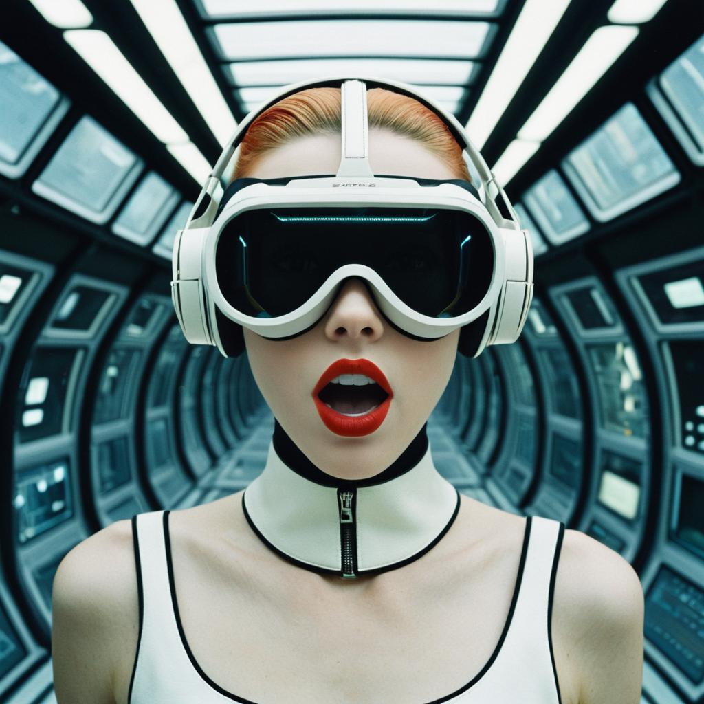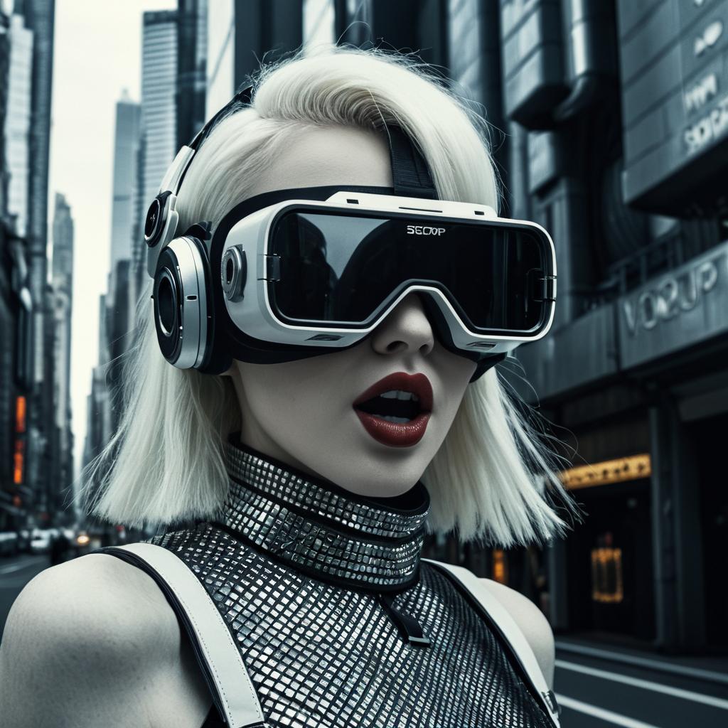 Trim Amina photography by Mario Testino, clear facial features, full body shot, 1960s black and white photograph, very close-up portrait looking straight at camera, beautiful fearless Berber woman, wearing futuristic VR goggles screaming, in the style of Greg Ruth, heavy makeup, futuristic jewelry, high fashion, vogue, futuristic city in the background, very detailed, cinematic, realistic, Leica M6, Tri-X, cinematic lighting, hyperrealistic