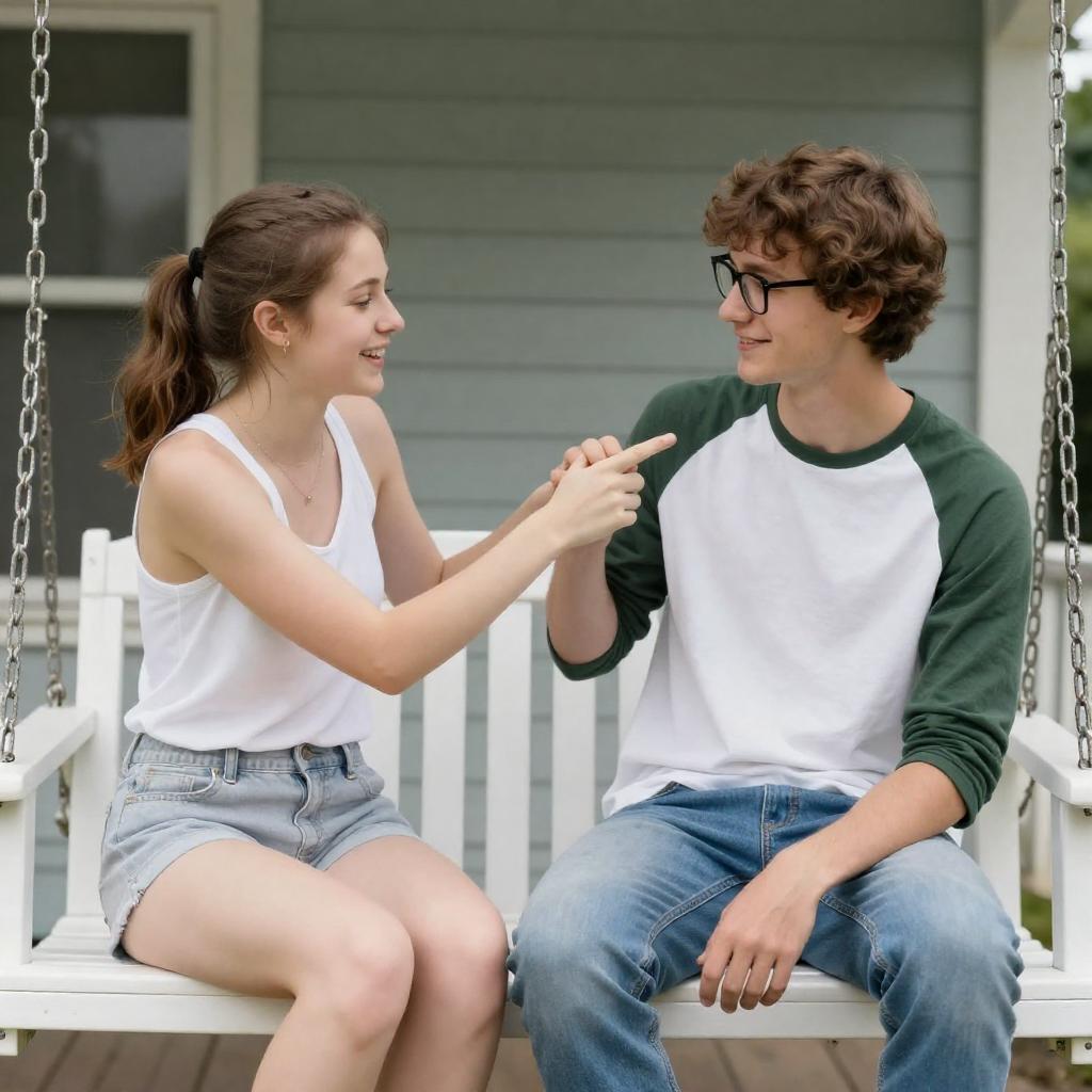Photograph of a young woman with light skin, brown hair in a ponytail, wearing a white tank top and gray shorts, playfully tugging the sleeve of a young man with light skin, brown hair, and glasses, dressed in a green and white raglan shirt and blue jeans. They sit on a white wooden swing on a porch with metal siding and chain swings in the background.