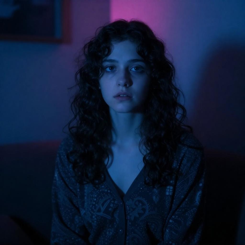 Photograph of a young woman with fair skin and brown, wavy hair, wearing black-rimmed glasses and a dark green button-up shirt. She gazes downward with a pensive expression, illuminated by soft light from the left, creating dramatic shadows on her face. The background is blurred and dark, emphasizing her contemplative mood.