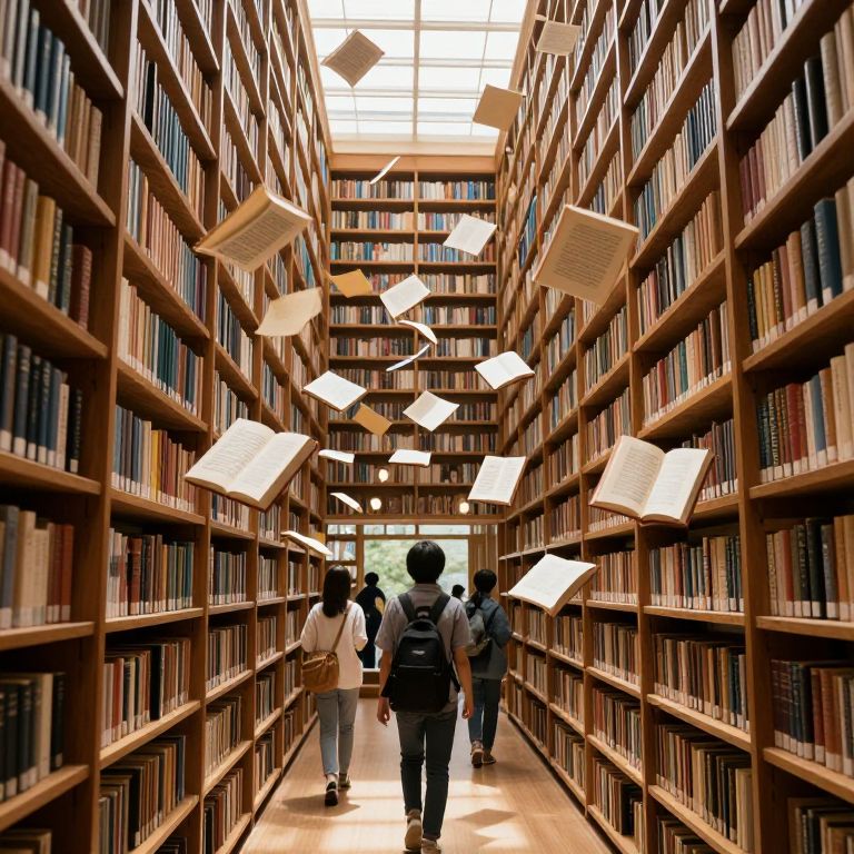 Books float gracefully above rows of wooden shelves in a sunlit library, their open pages suspended midair as students walk below, their movements causing the drifting sentences to rearrange in a mesmerizing dance of knowledge.