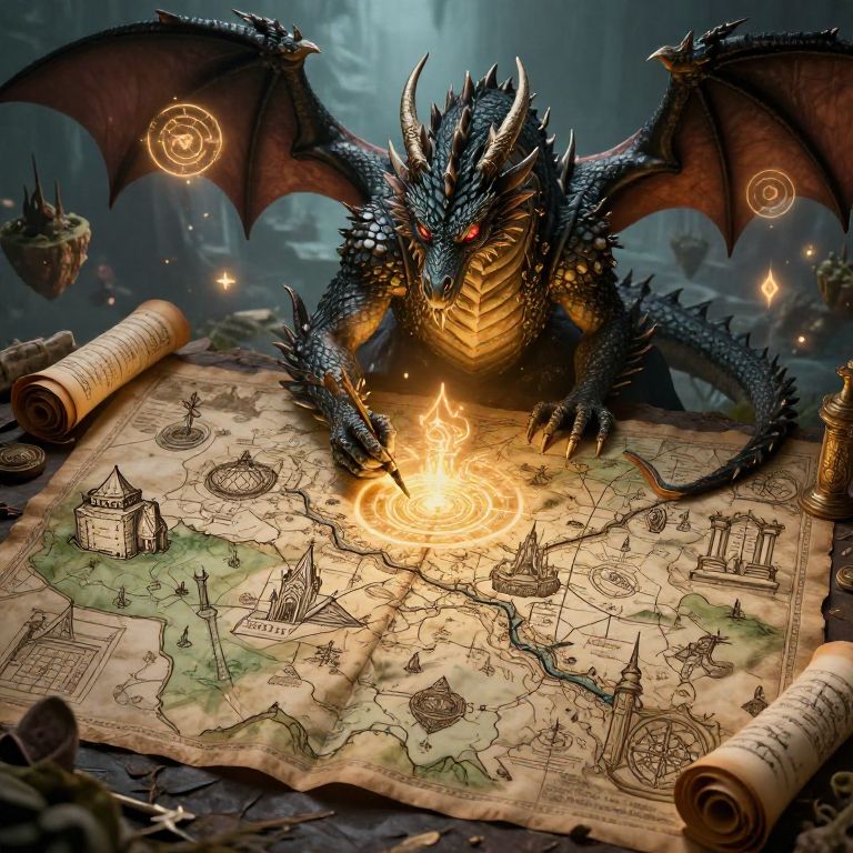 Dragon map maker in a fantasy setting, a wise dragon with ancient scrolls and mystical tools creating a detailed map of a magical kingdom, glowing runes and floating islands, intricate line work, fantasy art style, rich colors, epic atmosphere