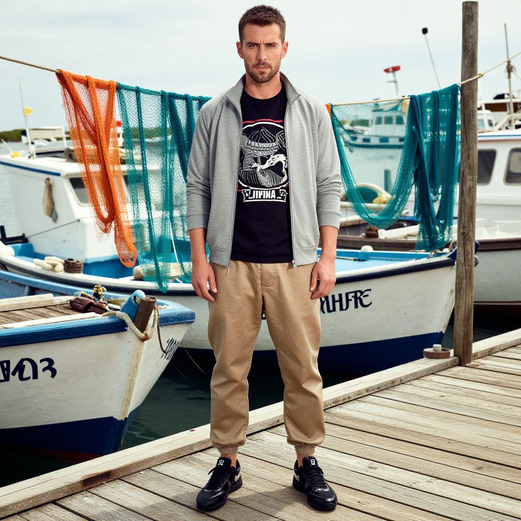 A man, slate gray track jacket, black graphic tee, relaxed-fit khaki joggers, sleek black cross-trainers, rustic wooden docks, weathered fishing boats, vibrant nets drying in the sun, lithographic film style, focused expression.Man has masculine face and piercing eyes