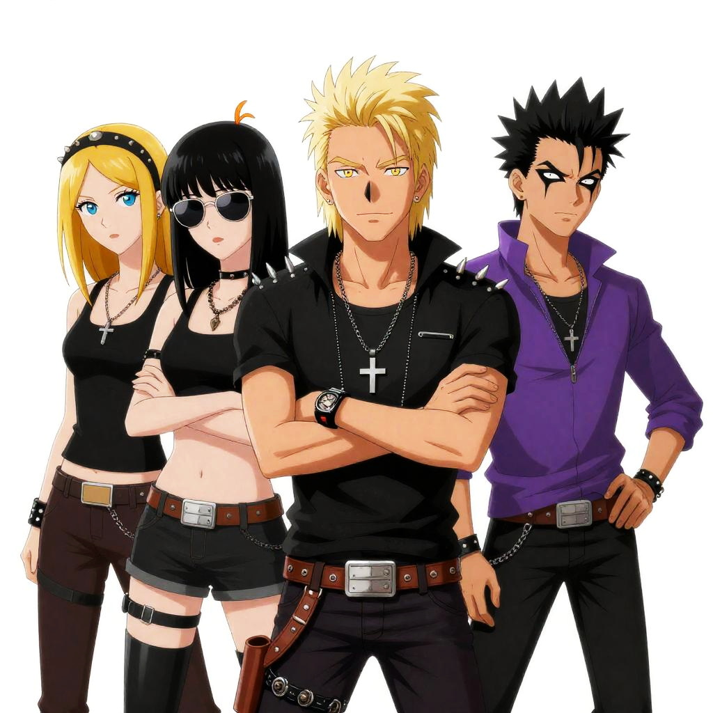 Colorful illustration of four rock musicians. Central male with blond hair, black shirt, and spiked shoulders; blonde female with black hair, spiked headband, and black top; male with black hair, sunglasses, orange mohawk, and leather straps; male with spiky black hair, black eye makeup, and purple shirt. All stand with arms crossed or hands on hips. White background.