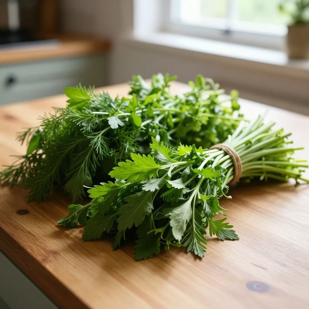 Close-up of two kilograms of fresh, vibrant herbs bundled together on a wooden kitchen table, with sunlight streaming through a nearby window, homey and natural.