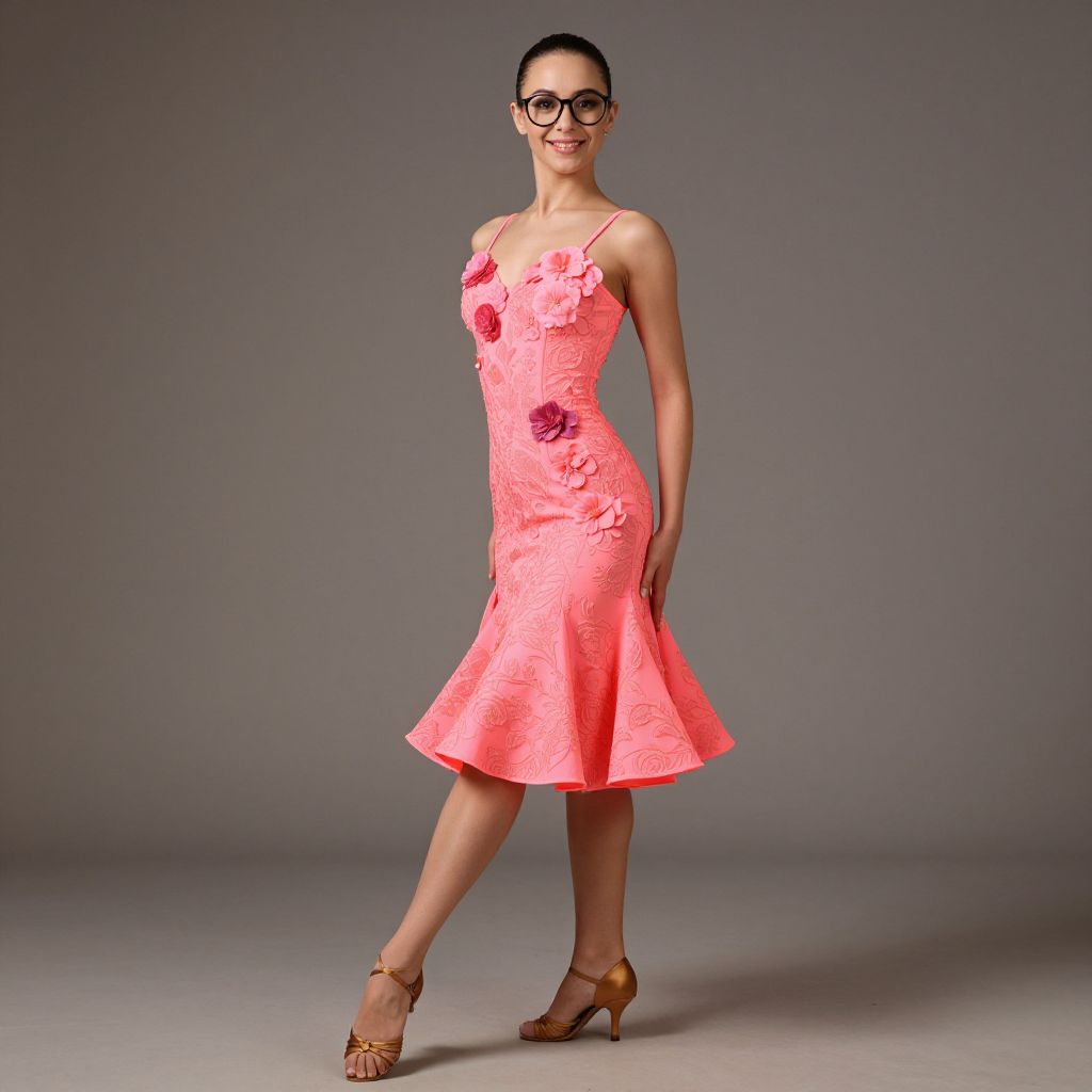 Latin ballroom dance dress, 1girl, solo, dress, flower, pink dress, standing, glasses, bare shoulders, smile, looking at viewer