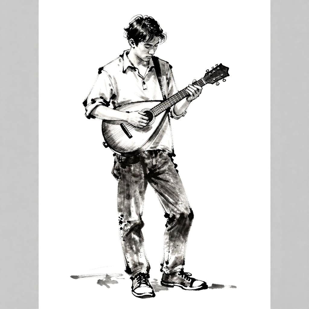 This is a sumi-e brush painting style study of a young man in a casual shirt and jeans holding a mandolin. One leg slightly forward, head tilted down, eyes on the strings. Quick gestural lines, confident hatching, smudged shading, casual and spontaneous. High contrast black and white on mostly white background with soft gray side borders and subtle paper texture. Clean composition, minimal props, slight figure tilt. Studio light from above, gentle falloff, elegant and restrained mood.
