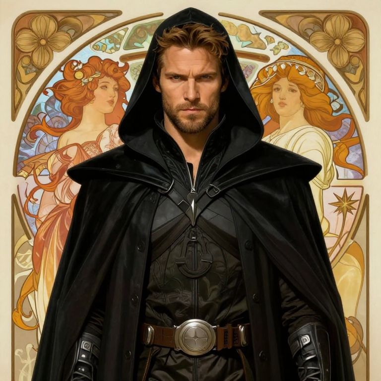 This digitally rendered image features a muscular, bearded man with light skin and brown hair, wearing a black hooded cloak with a high collar and a black, form-fitting shirt underneath. His cloak is fastened with a large, circular silver buckle. He stands in front of an ornate, stained-glass archway adorned with intricate floral patterns and two ethereal, red-haired women dressed in flowing, classical attire. The women have fair skin and wear flowers in their hair, with one in pink and the other in white, both gazing contemplatively forward. The man's intense, focused expression contrasts with the delicate, colorful background. The overall style combines elements of fantasy and Gothic art.