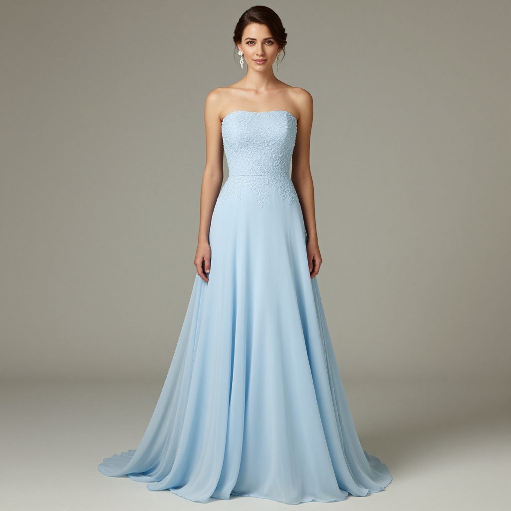 Photograph of a woman in a strapless, light blue, lace-embellished, floor-length wedding gown with a flowing skirt, standing against