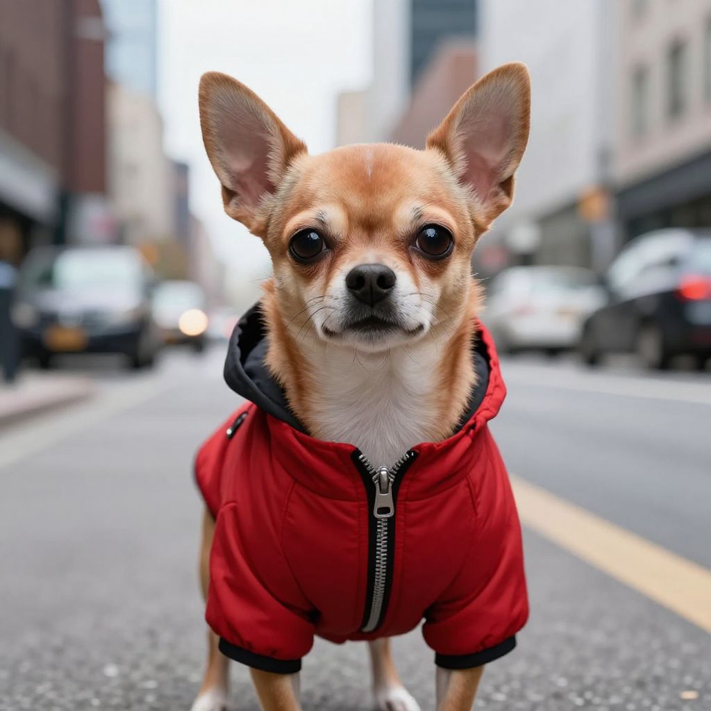 Photograph of a small tan Chihuahua with large ears, wearing a red zip-up jacket, standing on a city street with blurred cars and