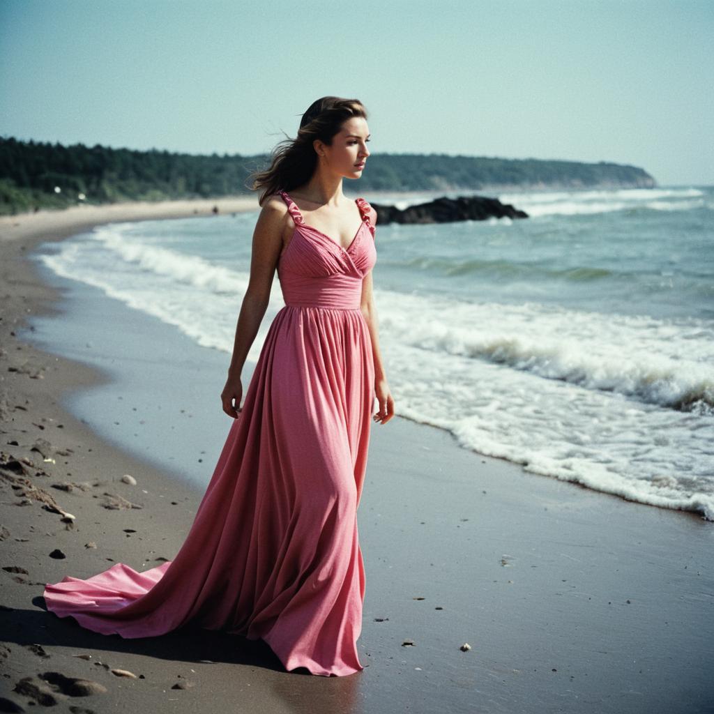 Stylish Gowns Woman Costume, a woman in a pink dress standing on a beach