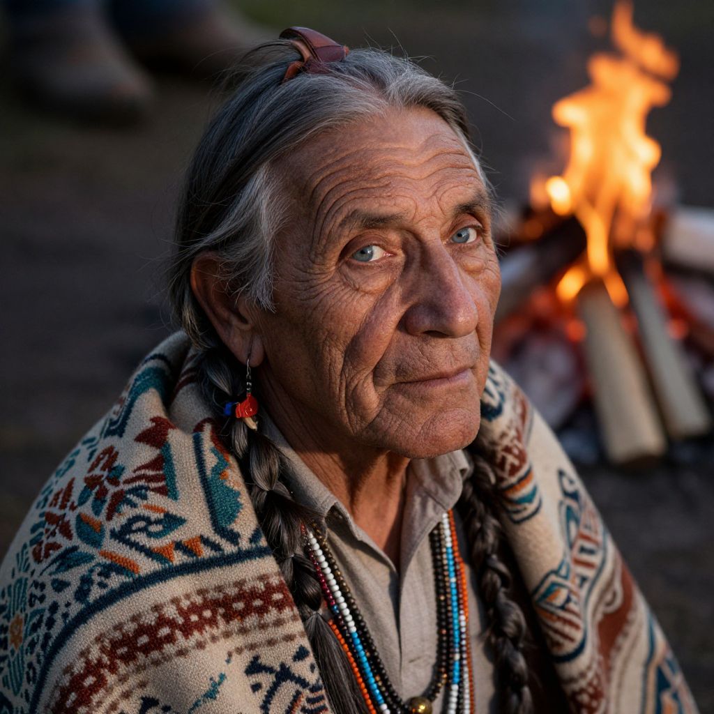 Photograph of an elderly Native American woman with long gray hair, wearing a patterned blanket and beaded necklace, gazing at a campfire.
