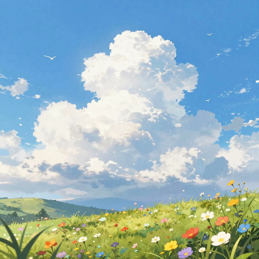Anime sky wallpaper 4k portraying a clear, vibrant daytime sky filled with puffy white clouds, a few birds soaring freely, and gentle sunlight illuminating a peaceful countryside filled with colorful wildflowers.