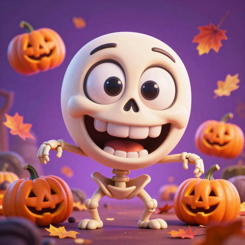 Cartoon-style skeleton with big eyes grinning widely, colorful whimsical background with floating pumpkins and autumn leaves, playful and friendly character design, soft lighting, fantasy halloween theme, dynamic and lively composition.