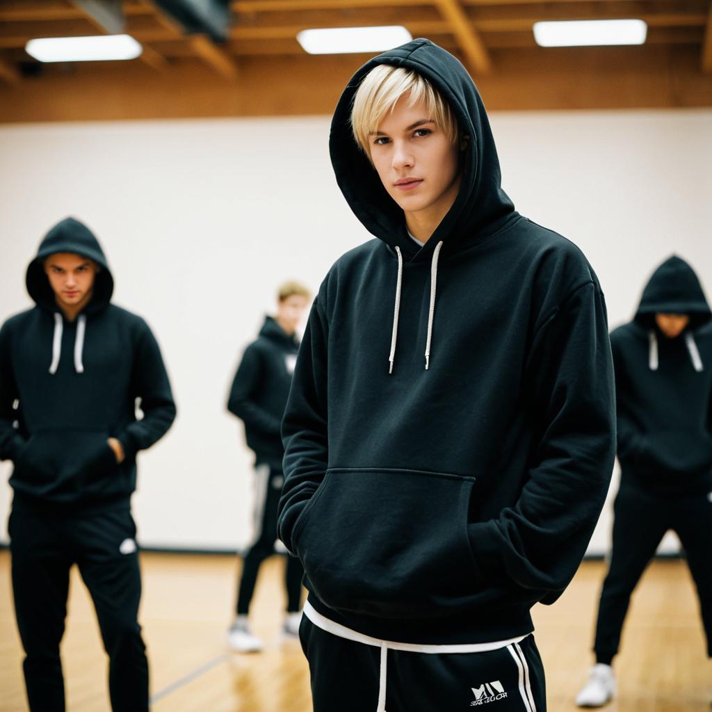 Dance practice outfit,realistic, hood, male focus, hoodie, pants, looking at viewer, blurry, solo focus, blurry background, black hoodie, long sleeves, 1boy, short hair, closed mouth, blonde hair, standing, hood down