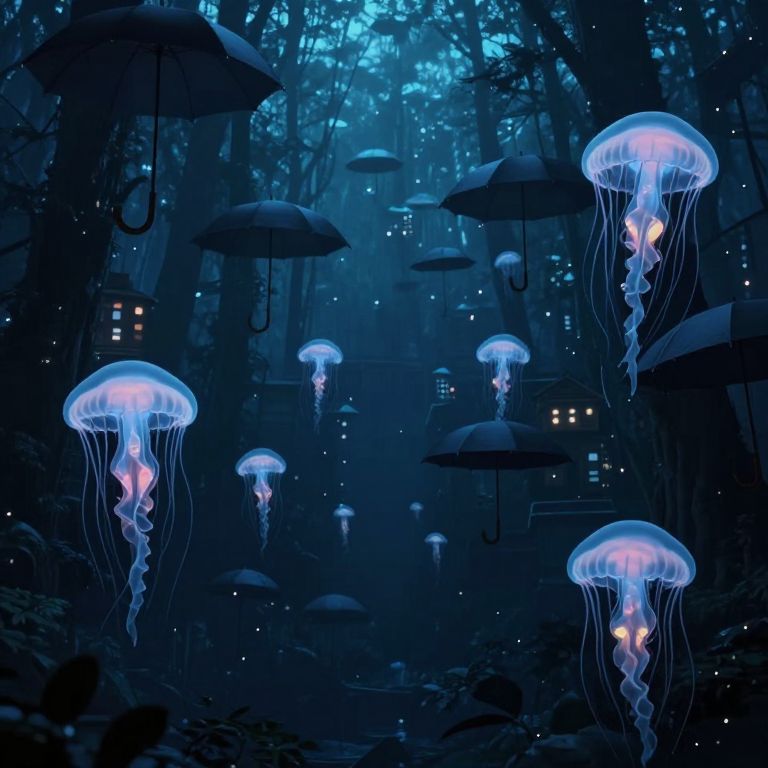 Photograph-like digital illustration of a dark, mystical underwater scene featuring glowing blue jellyfish with translucent domes and trailing, bioluminescent tentacles. The jellyfish are suspended in a dense forest of shadowy, silhouetted umbrellas. Soft, ethereal lights from distant, blurred windows illuminate the background, creating a magical ambiance. The overall color palette is dominated by deep blues and blacks, with vibrant blue and pink luminescence from the jellyfish. Tiny, sparkling particles float throughout the scene, enhancing the enchanting atmosphere.