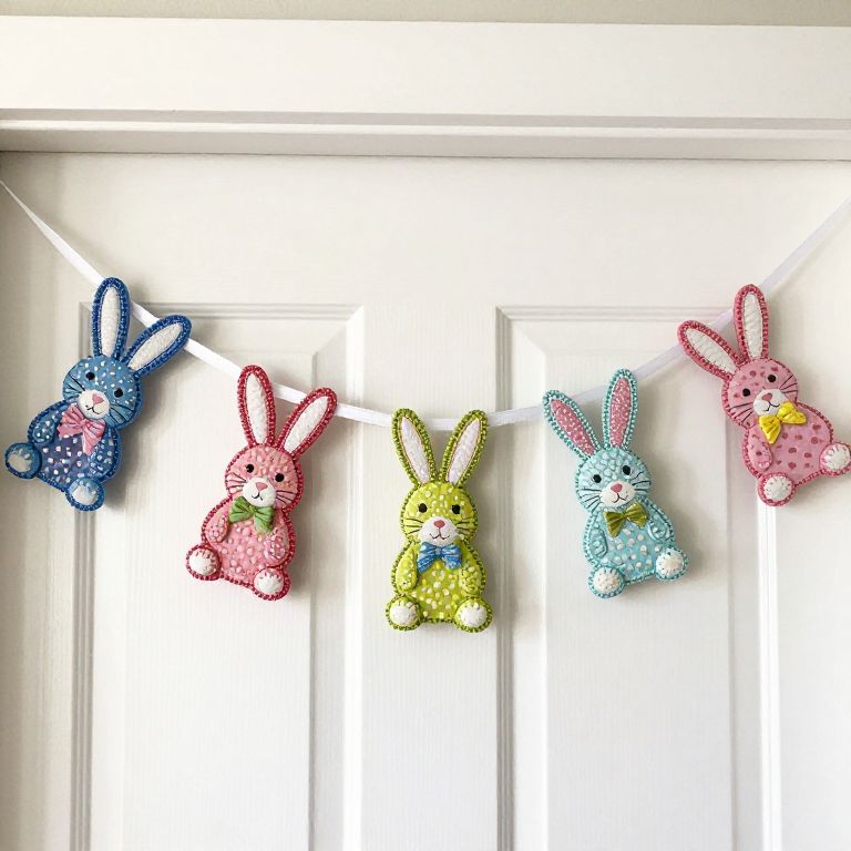 Colorful Easter Bunny Beaded Banner by CraftingAddiction on Etsy, featuring seven intricately crafted bunny shapes strung on a white ribbon, hanging symmetrically above a white door frame.
