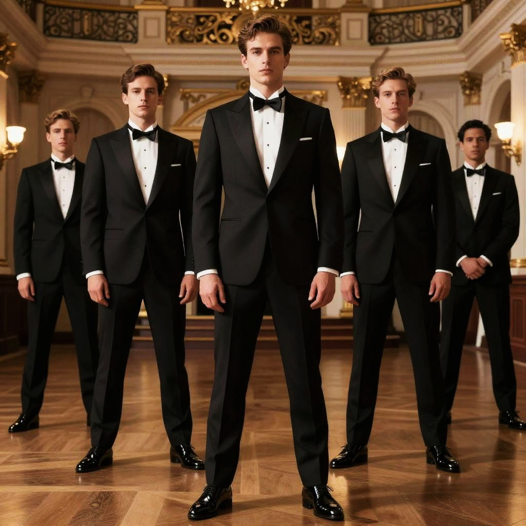 Formal dress men standing confidently in a grand ballroom, wearing tailored black tuxedos with crisp white shirts and bow ties, elegant lighting reflecting off polished shoes, intricate architectural details in the background, cinematic and sophisticated atmosphere.