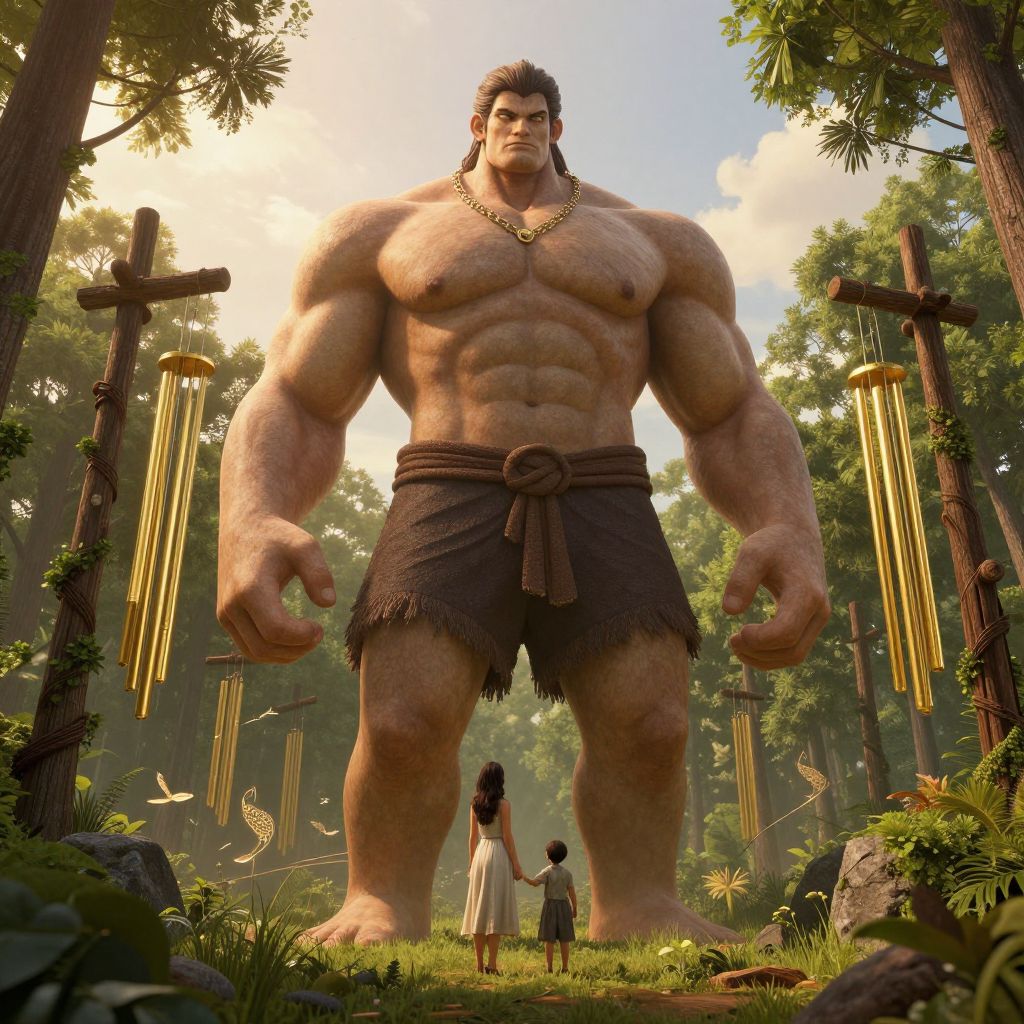 A towering, muscular giant stands amidst a serene forest, its massive form dwarfing a woman and child below, as golden wind chimes suspended from rustic poles play ethereal melodies under the golden-hour sky, blending fantasy and realism in a high-definition digital artwork.