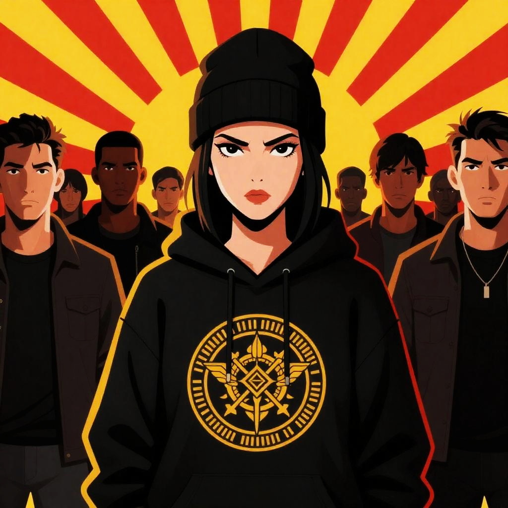 This is a bold, digital illustration in a pop art style. It features a central, stern-faced woman with pale skin and dark hair, wearing a black hoodie with a detailed emblem and a black beanie. She's surrounded by a crowd of serious-looking people with similar dark attire. The background has a striking red and yellow sunburst pattern, adding a dramatic effect.