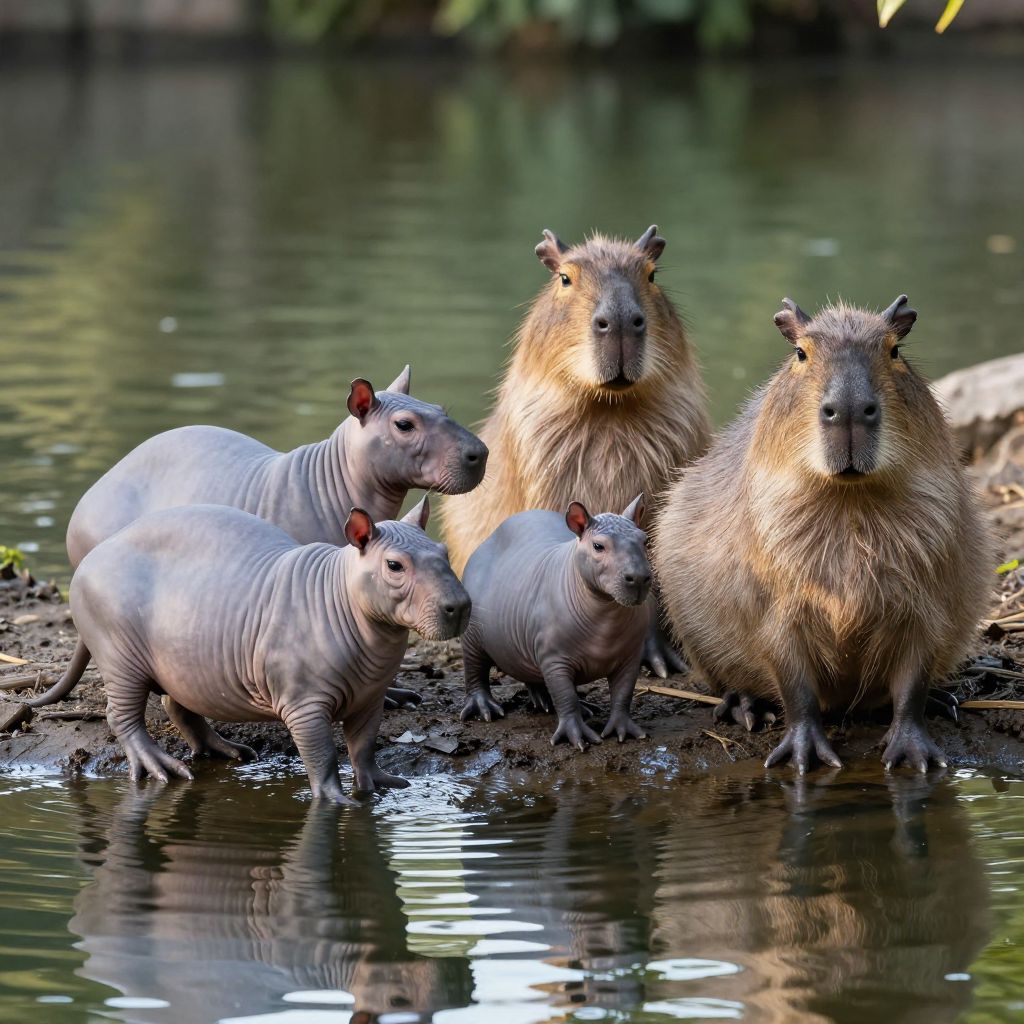 Hairless capybara family gathered near a tranquil pond, reflections shimmering in the water, realistic depiction emphasizing the unique lack of hair and smooth skin, early morning light casting soft shadows, rich natural environment brimming with wildlife details.