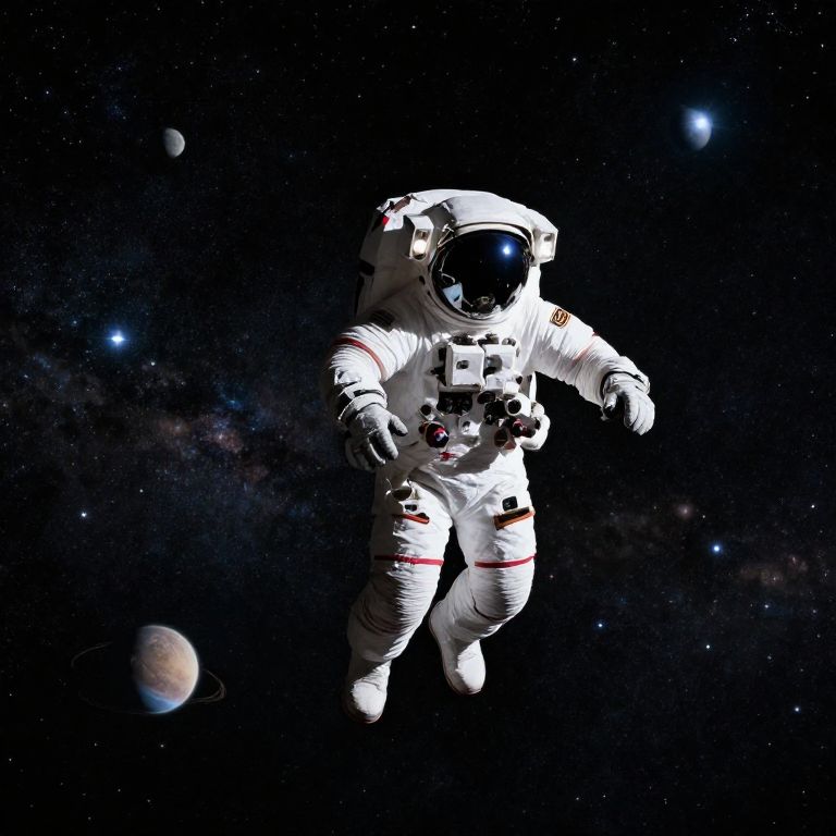 Digital artwork of an astronaut in a white spacesuit with a black helmet floating against a vibrant, colorful planet in space.