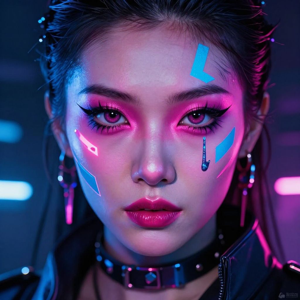 Exaggerated makeup on a futuristic cyberpunk character, neon pinks and blues, sharp geometric shapes, glowing accents, metallic textures, dark urban background, intense gaze