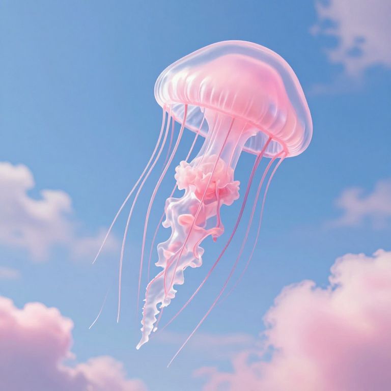 A surreal 3D-rendered scene depicts a colossal, translucent pink jellyfish gracefully floating amidst soft pastel clouds, its delicate tendrils cascading like celestial strings against a vibrant blue sky, evoking a dreamlike, otherworldly atmosphere.