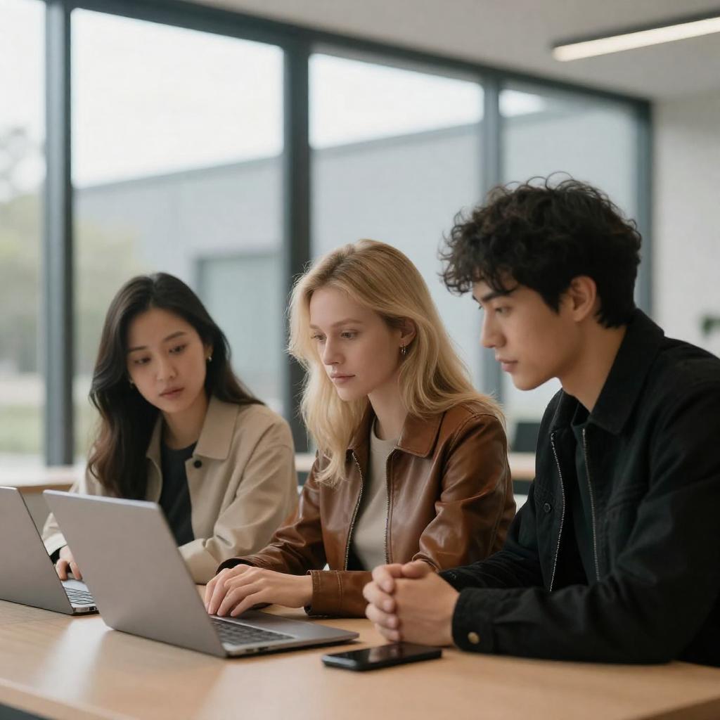 Photograph of two men in a dimly lit control room. The man in the foreground, with short dark hair and a black jacket, sits at a desk, focused on a screen. The man behind him, wearing a green cap and plaid shirt, operates a camera. Bright screens and blurred background lights create a busy atmosphere.