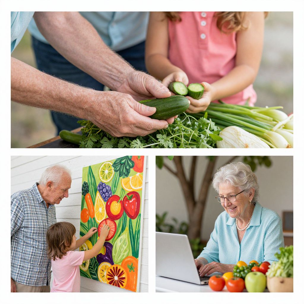 This photograph collage features three vibrant, colorful images of elderly individuals engaging in gardening and cooking activities. The top image shows an elderly man and woman, with the man's weathered hands holding a cucumber while the woman, in a pink sleeveless top, assists. Fresh vegetables, including cucumbers and green onions, are on a wooden surface. The bottom left image captures an elderly man and young girl standing in front of a vividly colored floral painting; she touches the painting as he smiles. The bottom right image depicts an elderly woman with short gray hair, glasses, and a light blue shirt, working on a laptop amidst a bowl of tomatoes and apples. The background includes blurred greenery and a tree.