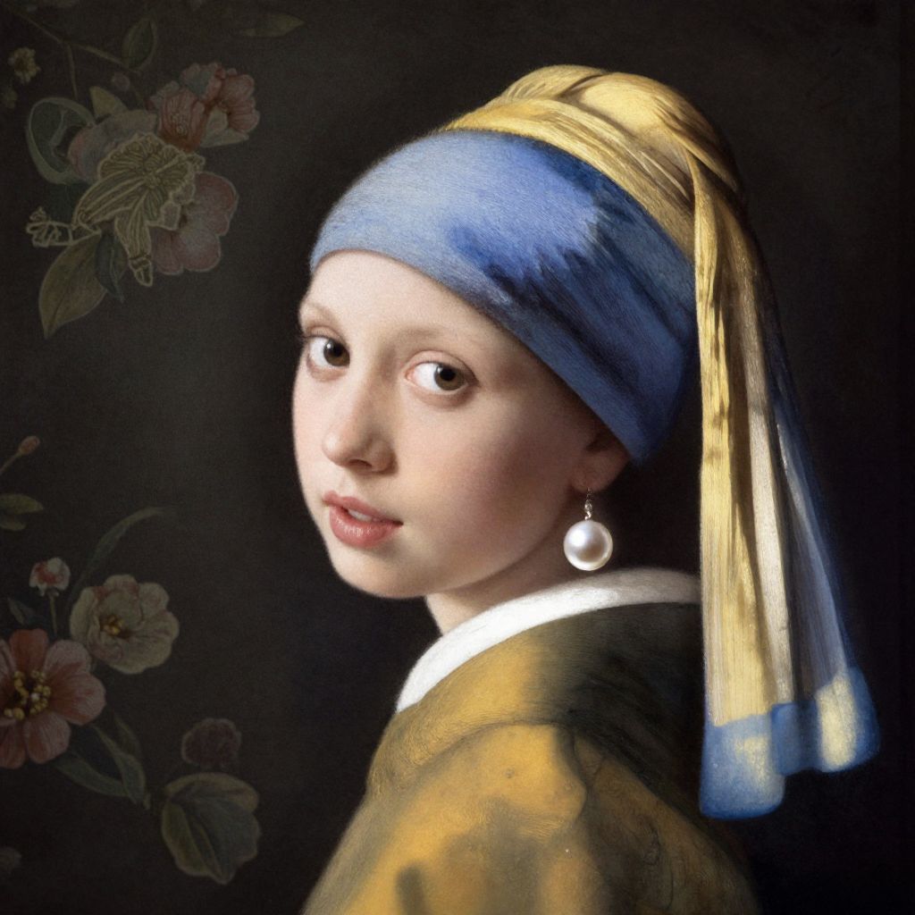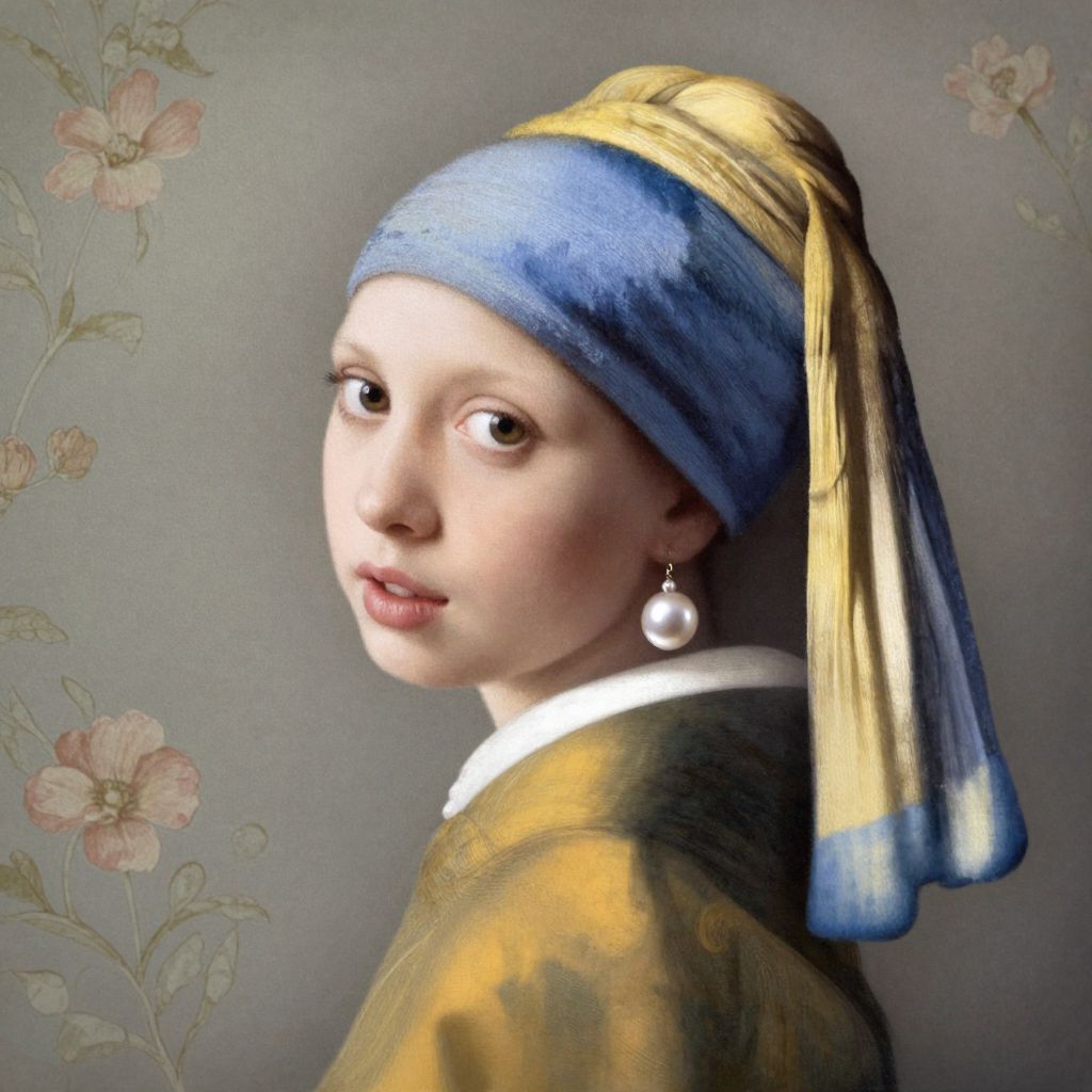 A digitally illustrated portrait inspired by \"Girl with a Pearl Earring,\" featuring a woman adorned with pearl jewelry, set against a floral-patterned background, showcasing a vintage and elegant aesthetic reminiscent of classic portraiture.