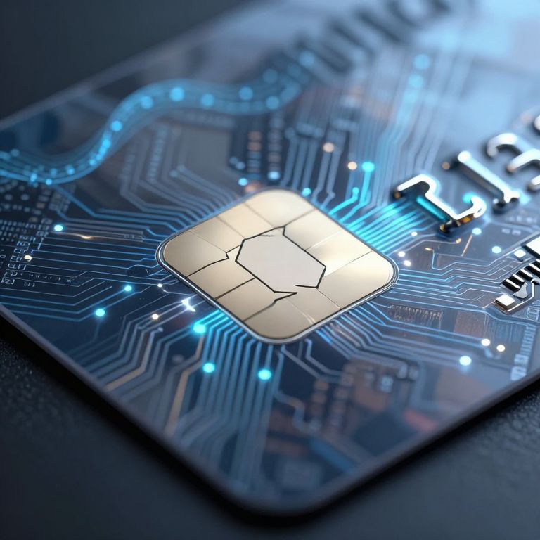 Close-up of RFID chip embedded in a transparent credit card, intricate microchip detail, digital circuitry glowing softly, background of data waves and light beams, futuristic sci-fi style, metallic textures mixed with smooth glass surfaces, high-tech financial theme