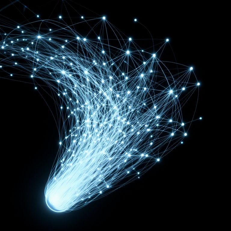 Information scent illustrated as glowing connecting threads weaving through a complex network of information nodes, abstract tech art style, high contrast colors