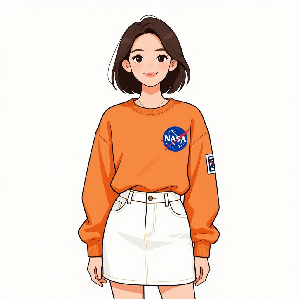 Woman with pretty face and pretty hair. smiling Woman, casual streetwear, bright orange long-sleeve crewneck sweatshirt with NASA logo, blue and white graphic patches on left sleeve, white mid-thigh length skirt with a straight hem, minimal jewelry with a thin necklace, plain white background. --sref 1467