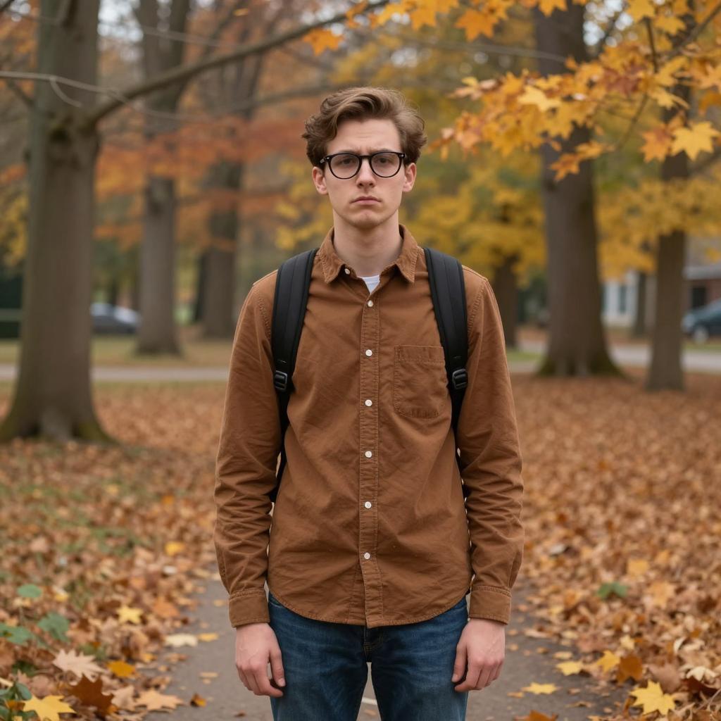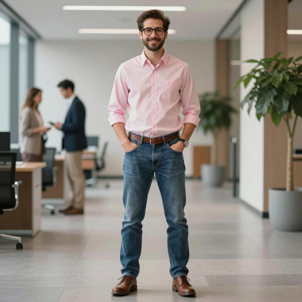 Steve costume, photograph of a young man standing indoors, stone wall background, wearing a colorful plaid shirt with rolled-up sleeves, blue jeans, brown leather shoes, hands in pockets, casual style, natural light from the left, neutral facial expression, standing on a tiled floor, realistic ure, daytime setting, medium shot, front view