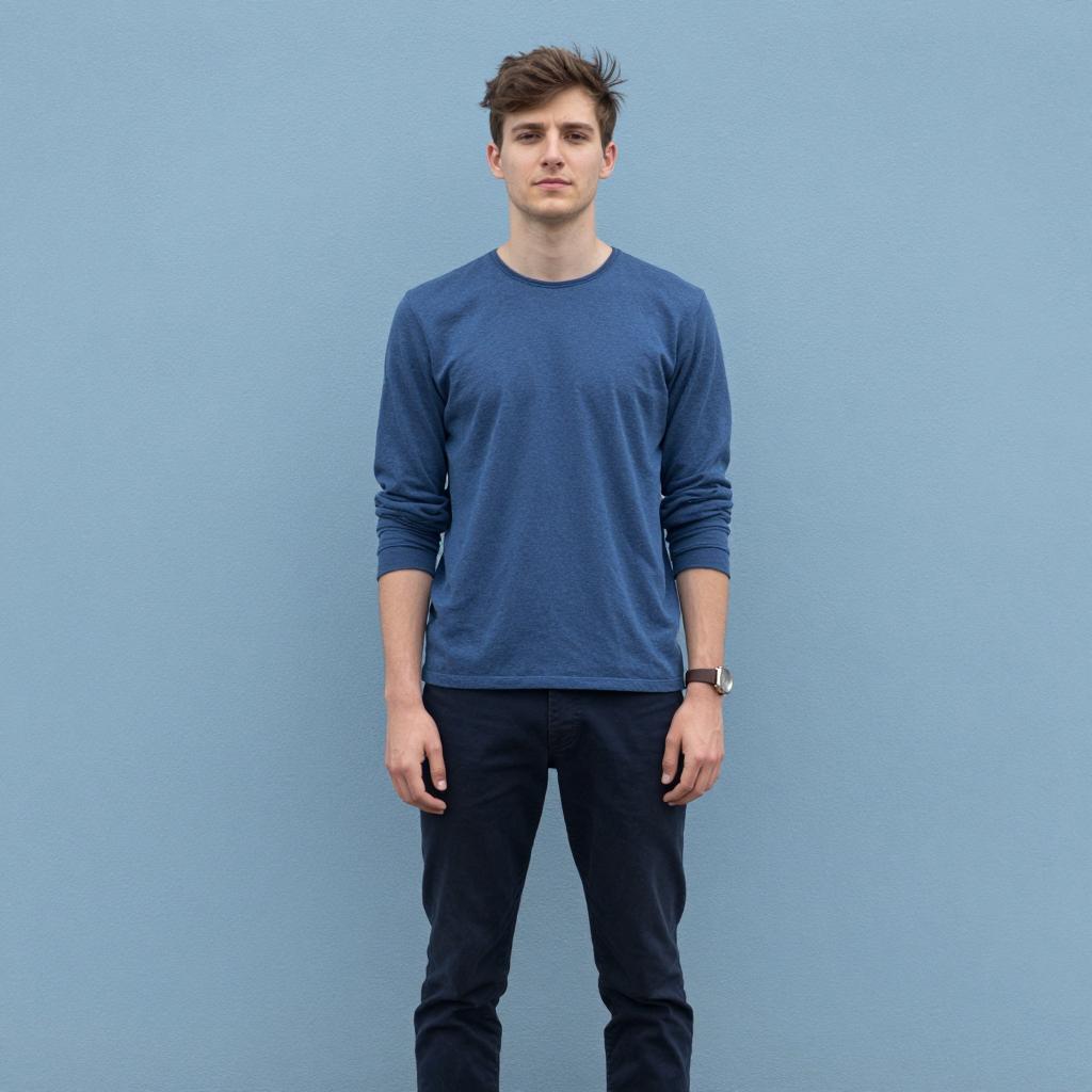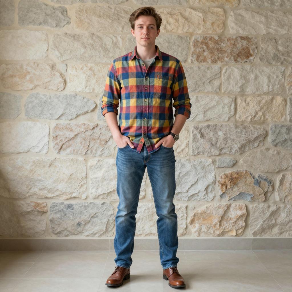 Photograph of a young Caucasian man standing indoors against a textured stone wall background. He is wearing a colorful plaid shirt with rolled-up sleeves, blue jeans, brown leather shoes, and a watch. His hands are casually in his pockets, and he has a neutral expression. The setting features natural light coming from the left, tiled floor, captured in a medium front view shot during daytime.
