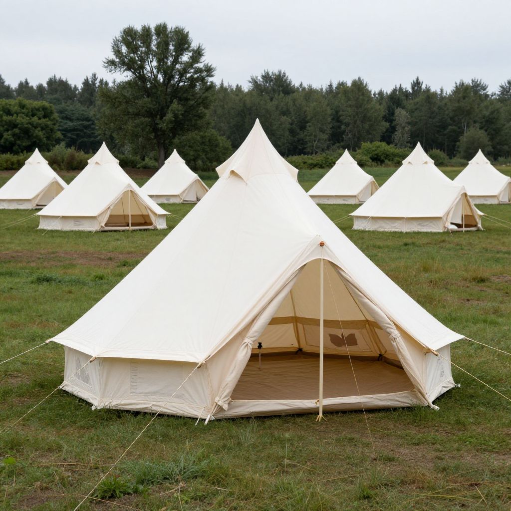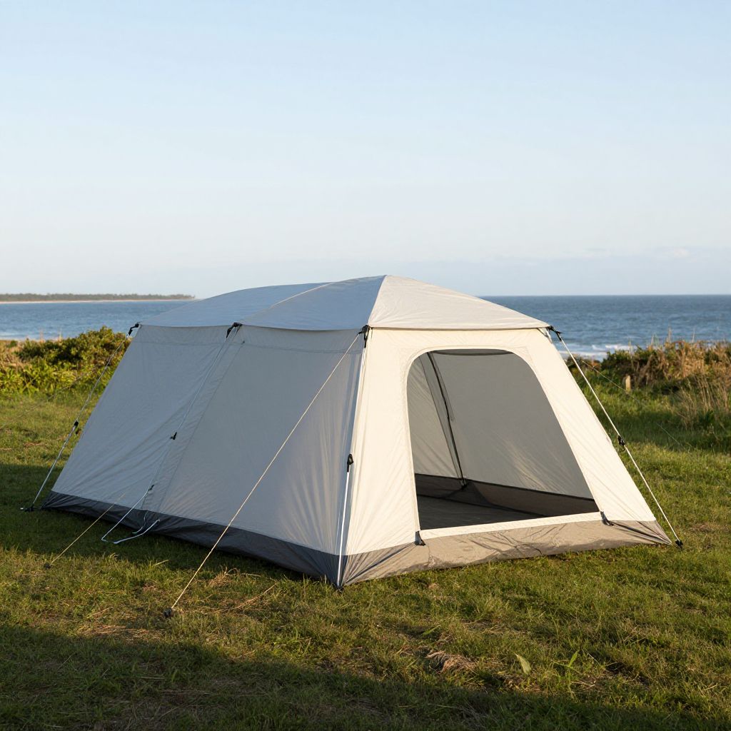 Photograph of a white and gray camping tent with black accents, set on grassy terrain near a serene ocean view under clear blue sky.