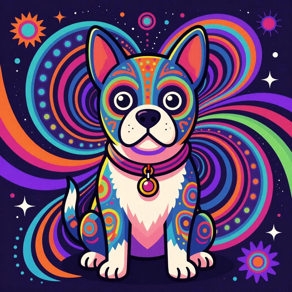 Psychedelic dog art featuring a colorful, swirling background with a trippy, cartoonish dog at the center, vibrant neon colors, intricate patterns, surreal style