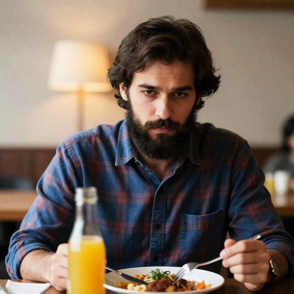 Man with medium-length black hair and beard, wearing gray shirt and dark pants, reclining on brown couch, holding beer bottle. Legs up, showing black boot soles with deep treads. Red pillow under his head. Wooden-paneled wall, window with reflections. Casual, relaxed posture.