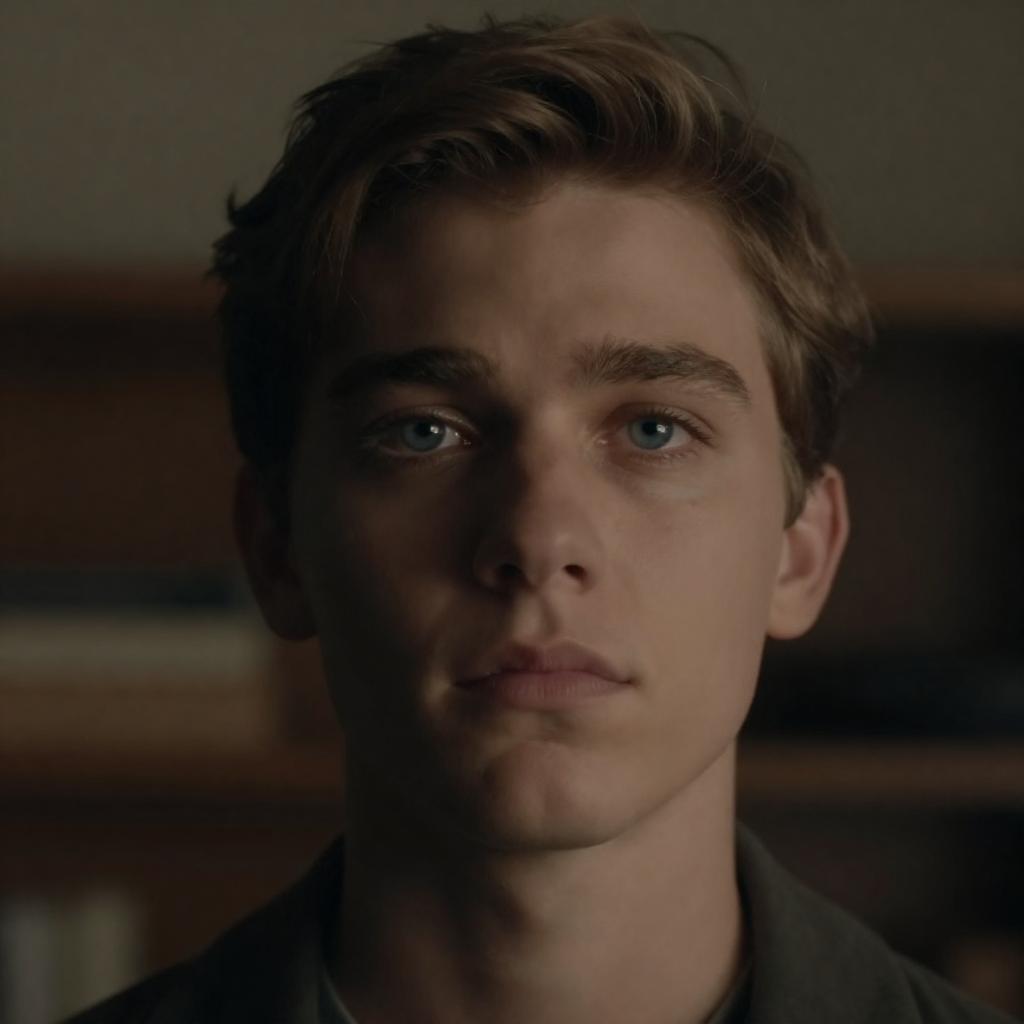 Close-up photograph of a young man with light skin, dark brown hair, and a slight smile, partially illuminated from the side. He wears a dark jacket, leaning forward, with dimly lit background. Intense, focused facial expression.