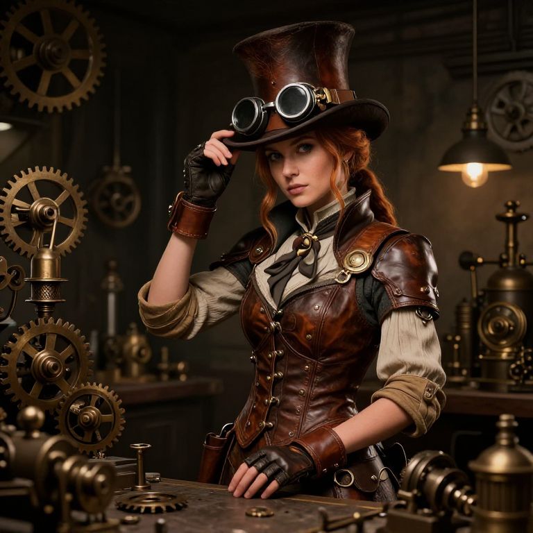 Realistic steampunk girl art, featuring a female engineer in a Victorian-inspired workshop filled with mechanical devices, cogs, and steam-powered gadgets, wearing a top hat with goggles and fingerless gloves, dramatic lighting highlighting metal and leather textures.