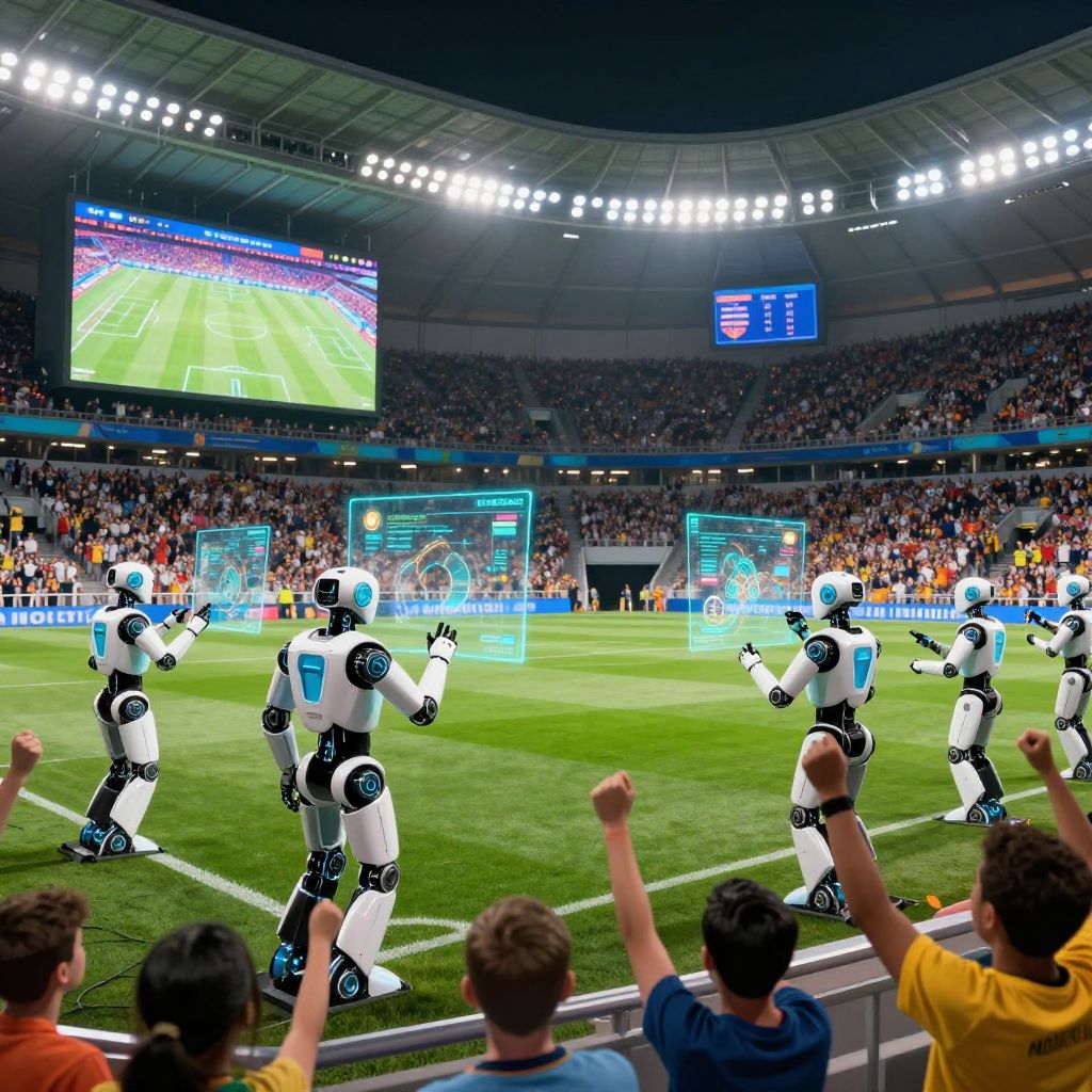 Football prompt latest: A futuristic stadium at night with glowing holographic scoreboards and dynamic player animations, celebrating the newest football match highlights with digital effects and immersive lighting.