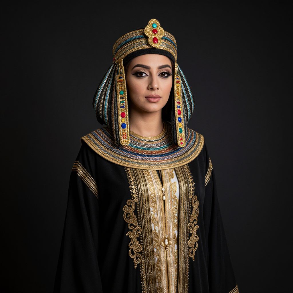 A woman dressed in traditional Egyptian national costume stands against a dark background, showcasing intricate embroidery and gold detailing on her black garment. Her headdress features elaborate patterns with gold and colored accents, emphasizing the cultural heritage of the outfit in a realistic portrait style.