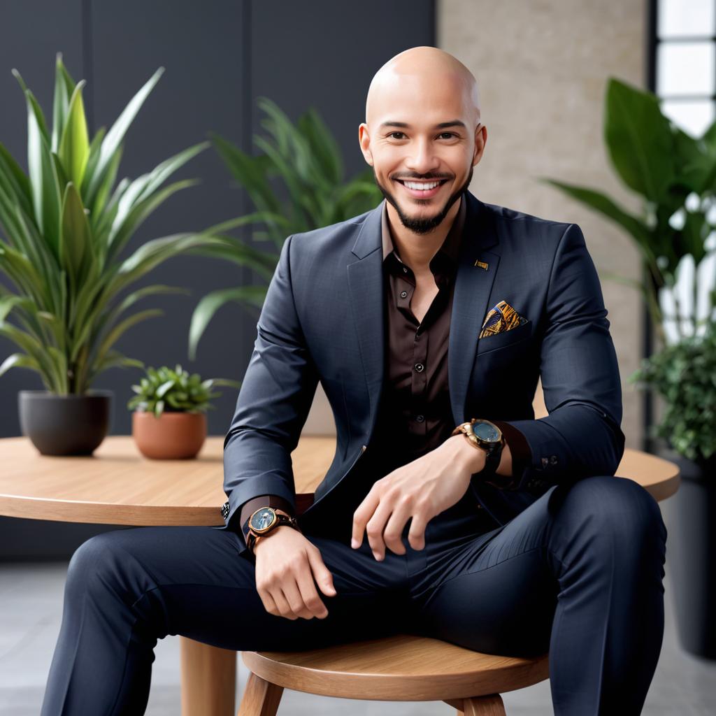 A smiling bald man dressed in a black suit and white t-shirt, sitting outdoors on a concrete ledge with green leafy plants in the background. The man is accessorized with two wristwatches and a pocket square, displaying a confident and approachable demeanor.