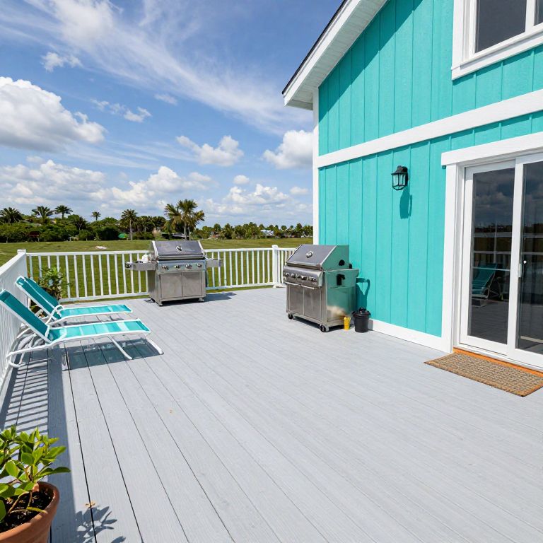 Deck of Azure Teal Lodge with grill lounge sunning chair just around corner