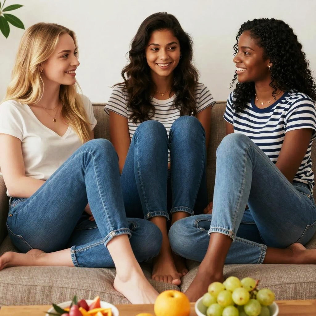 Multiple girls, blurry, cup, black hair, blonde hair, drinking straw, drink, food, realistic, 3girls, long hair, holding, blurry background, depth of field, fruit, closed eyes, holding cup, drinking glass, leaf, smile, ice cube, jewelry, bracelet, 2girls, looking at another