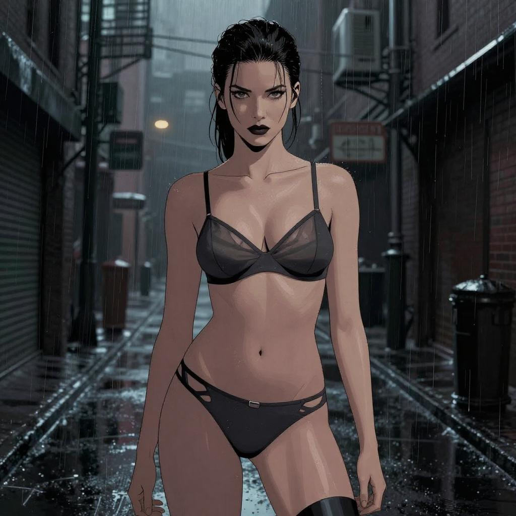 Image in the style of graphic novel noir, mysterious private detective woman, low tousled ponytail, lean angular, lingerie cut-out set, charcoal sheer deconstructed bralette, matching asymmetric panties, dark rain-soaked urban alley studio background