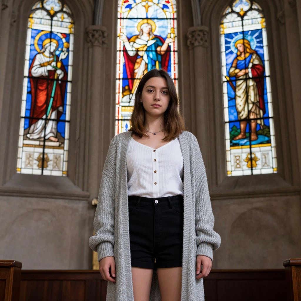 Photograph of a young woman standing in a church with three colorful stained glass windows behind her. She has fair skin, straight brown hair, and wears a white button-up shirt with black high-waisted shorts, layered with a loose, gray, knitted cardigan. The stained glass windows depict religious figures in vibrant hues of blue, red, and yellow. The church's stone walls and wooden pews are visible in the background. The woman's expression is neutral, and she stands centered in the frame, looking directly at the camera. The lighting is natural, highlighting the stained glass and her outfit.
