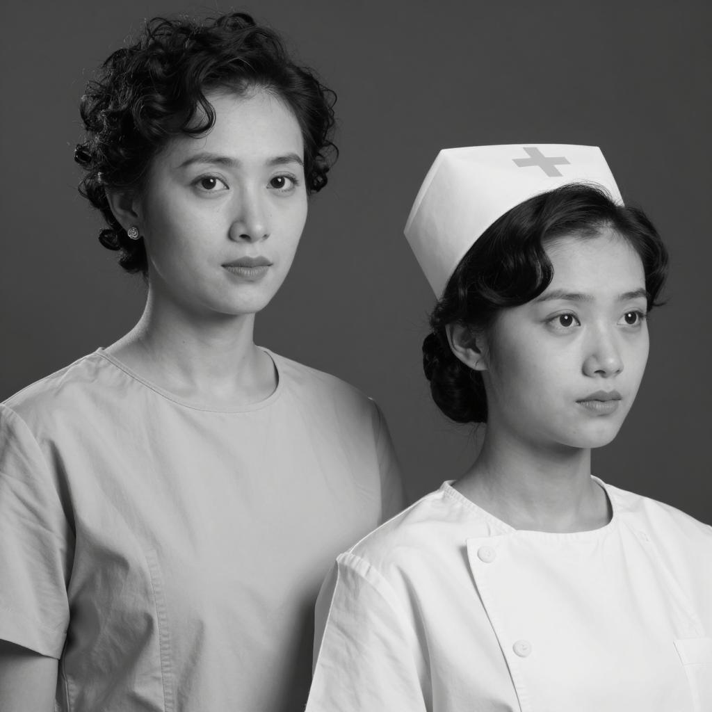 Black and white photograph of a woman with wavy, shoulder-length hair wearing a white nurse's cap and uniform. She is in profile, looking to the left with a serious expression. She is holding a medical instrument in her right hand. The background shows a dimly lit, ured wall. A candlestick is visible in the background on the right.