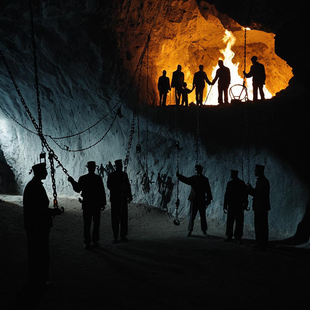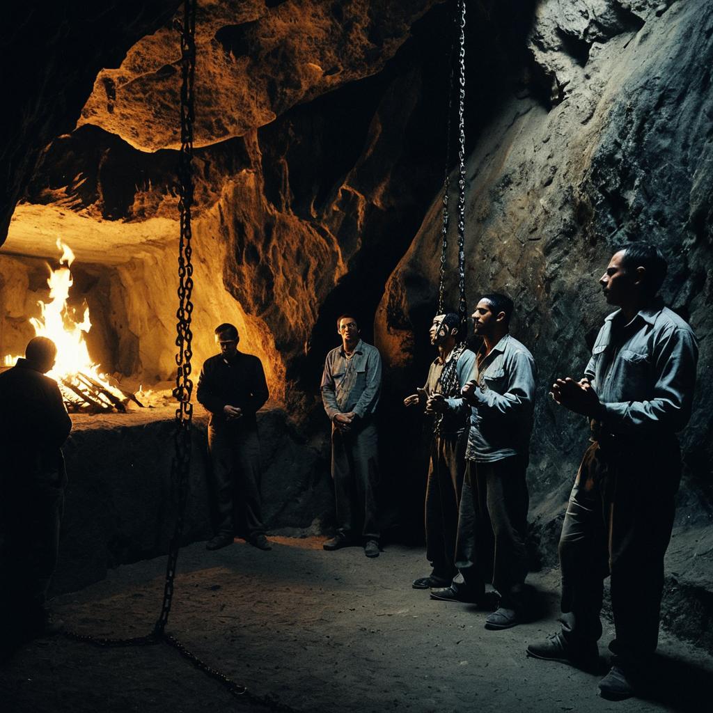 Surreal image of six skeletal figures dressed in black and white striped bodysuits, suspended by chains from the ceiling inside a dimly lit cave. The figures appear motionless, facing a central fire pit with flames. The setting evokes a mysterious and eerie atmosphere, emphasizing themes of captivity and shadow play.