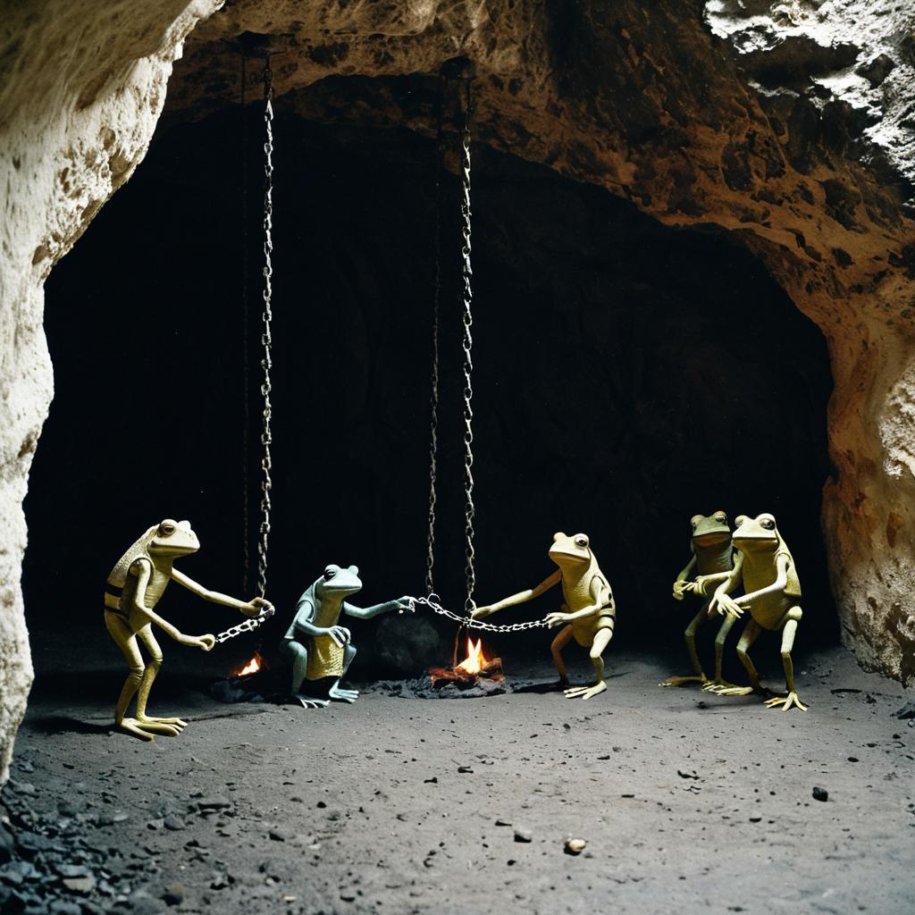 Pigments people untutored in the Theory of Forms to prisoners chained in a cave, unable to turn their heads. fauns, surrealism, All they can see is the wall of the cave. Behind them burns a fire. Between the fire and the prisoners, there is a parapet, along which puppeteers can walk. The puppeteers, who are behind the prisoners, hold up puppets that cast shadows on the wall of the cave